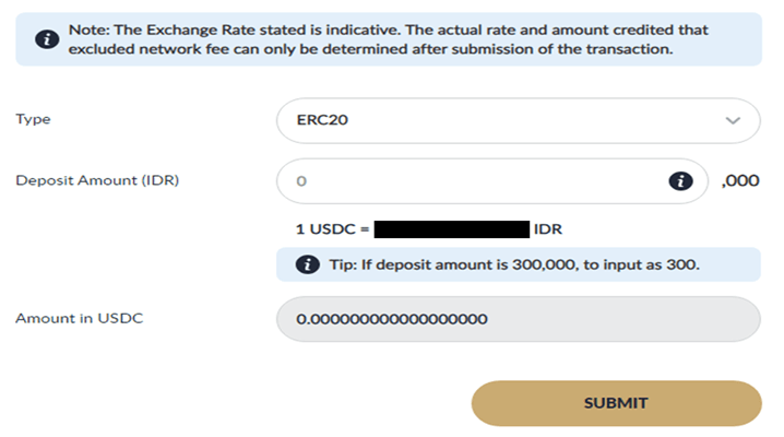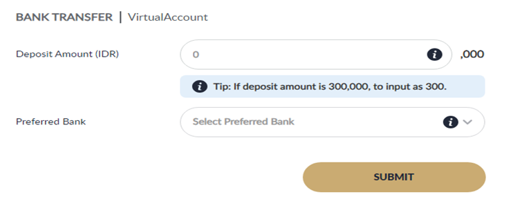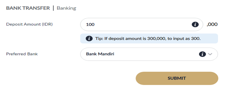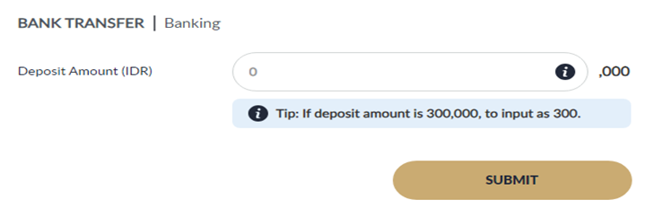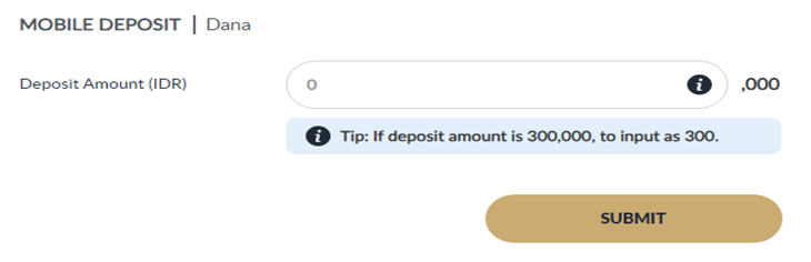 - Input the deposit amount → Choose preferred bank → Click "SUBMIT".