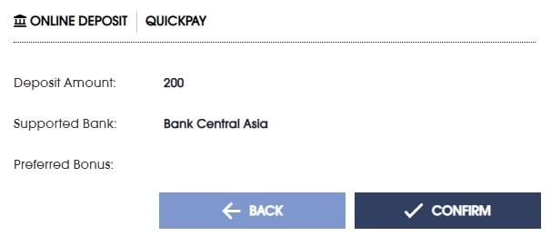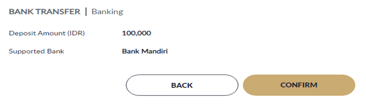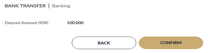 - Click CONFIRM to be re-directed to a new page or click BACK to modify your deposit amount.