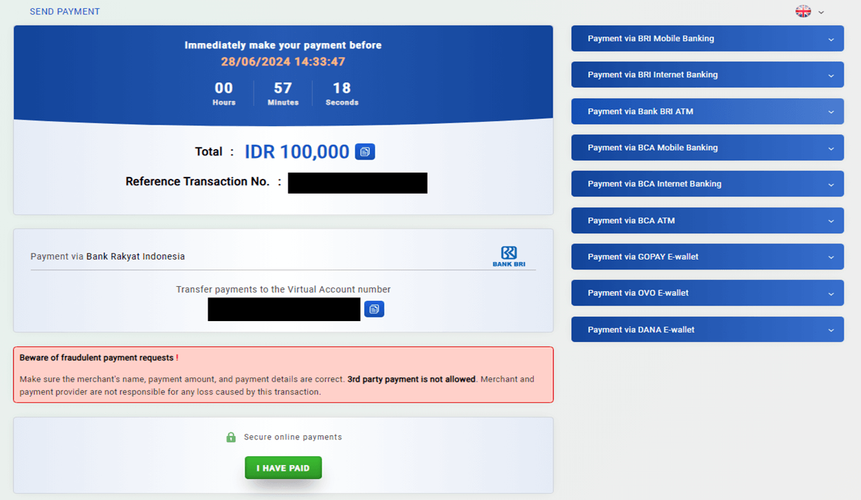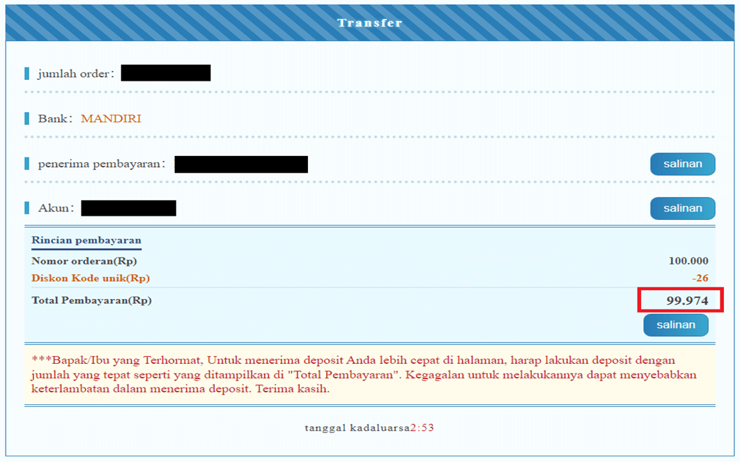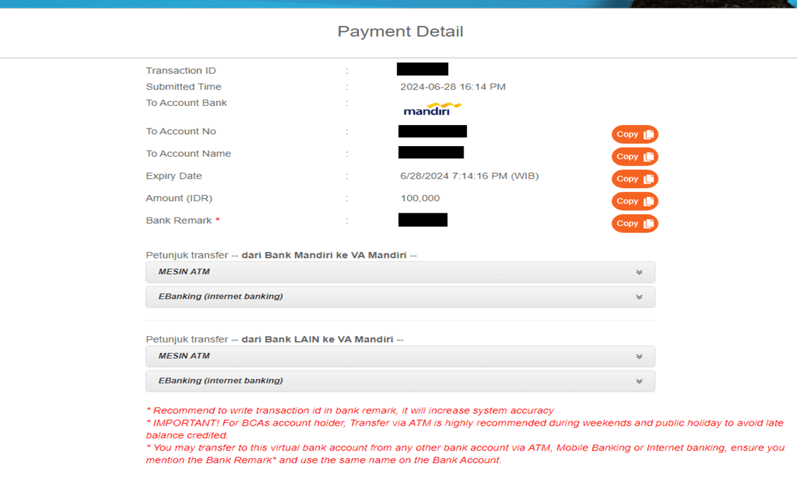 - Copy the virtual bank account and transfer immediately according to total payment request (unique amount).