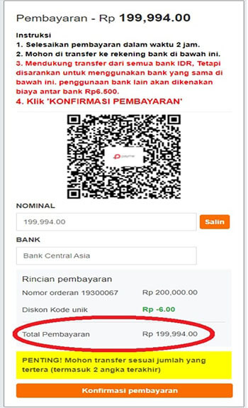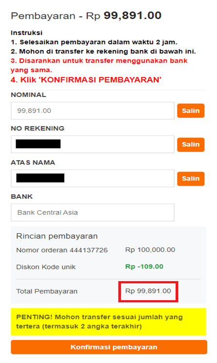 - Copy the virtual bank account and transfer immediately according to total payment request (unique amount). After that, click "KONFIRMASI PEMBAYARAN".