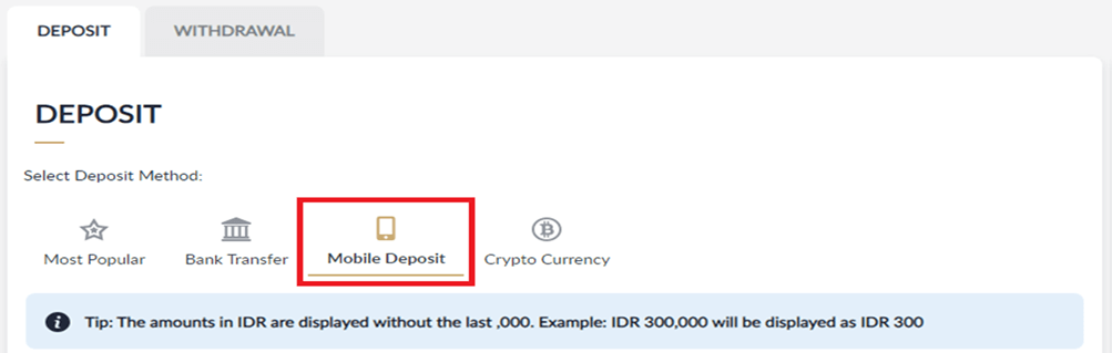 - Click "DEPOSIT" tab → Click "MOBILE DEPOSIT" → Click "OVO".