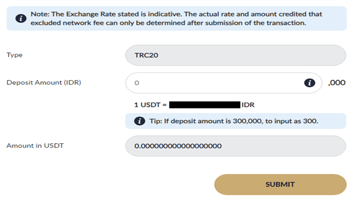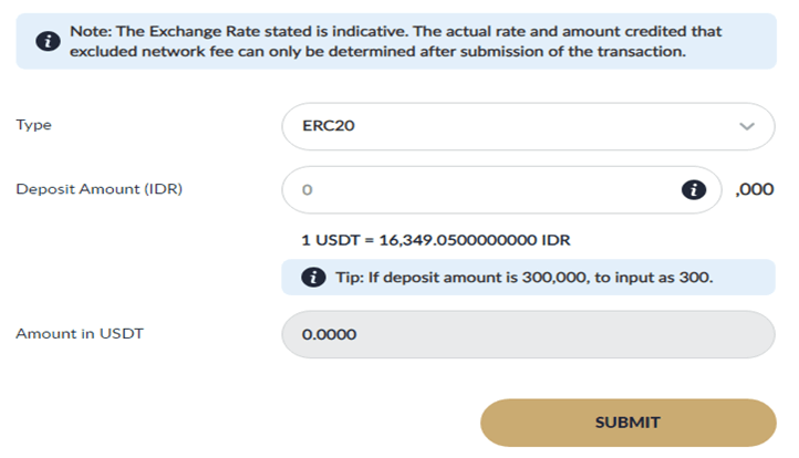 - Choose the channel "TYPE" (ERC20 or TRC20) → Input the deposit amount → Click "SUBMIT".