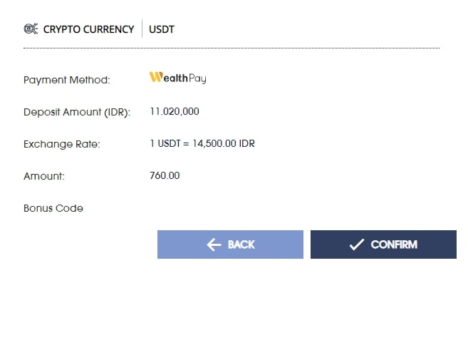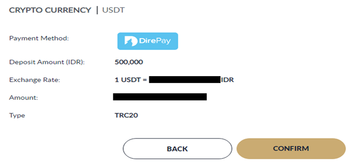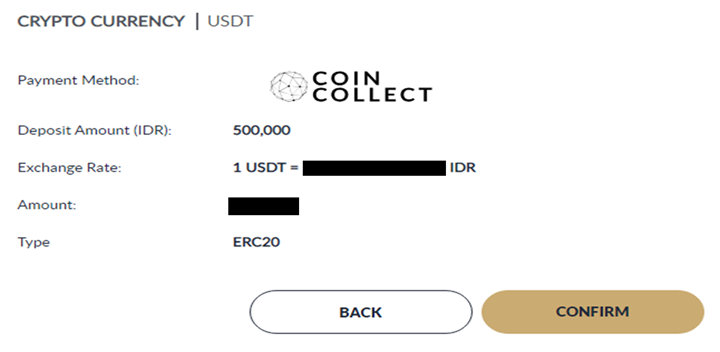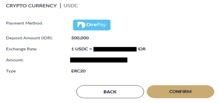 - Click Confirm to be redirected to crypto transaction page or click Back to change your deposit amount (Make sure to enable pop – up window)