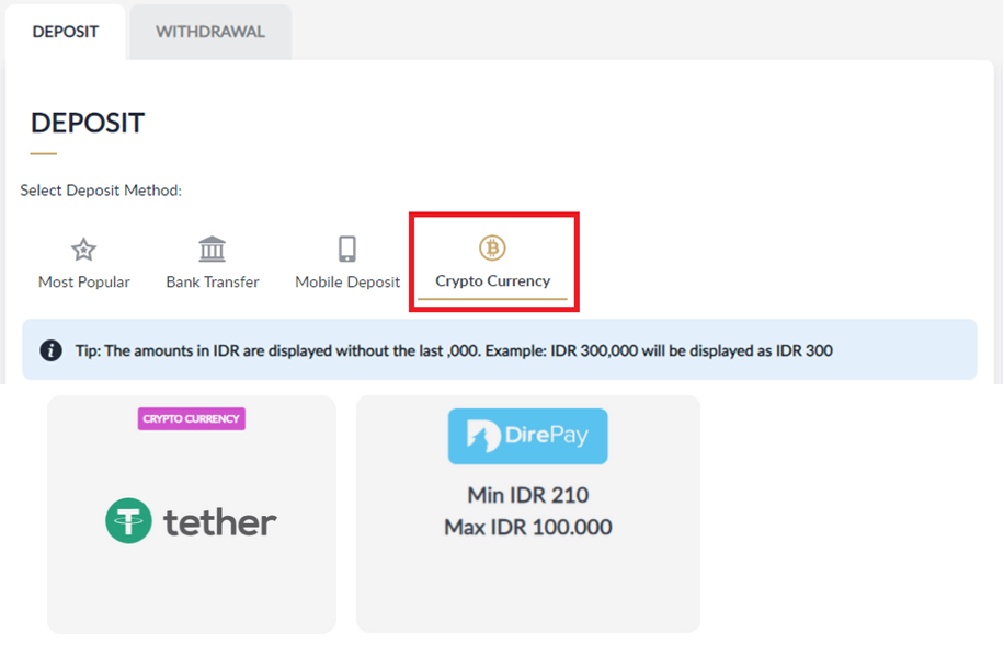 - Click "DEPOSIT" tab → Click "CRYPTO CURRENCY" → Click "TETHER" → Click "DIREPAY".
