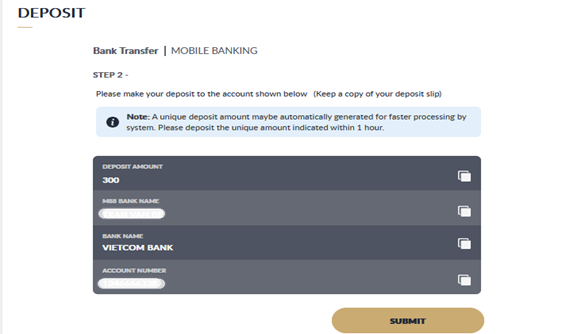 - Our bank account where you can transfer your deposit will be displayed, Do deposit from your bank to M88 bank account then click "SUBMIT"