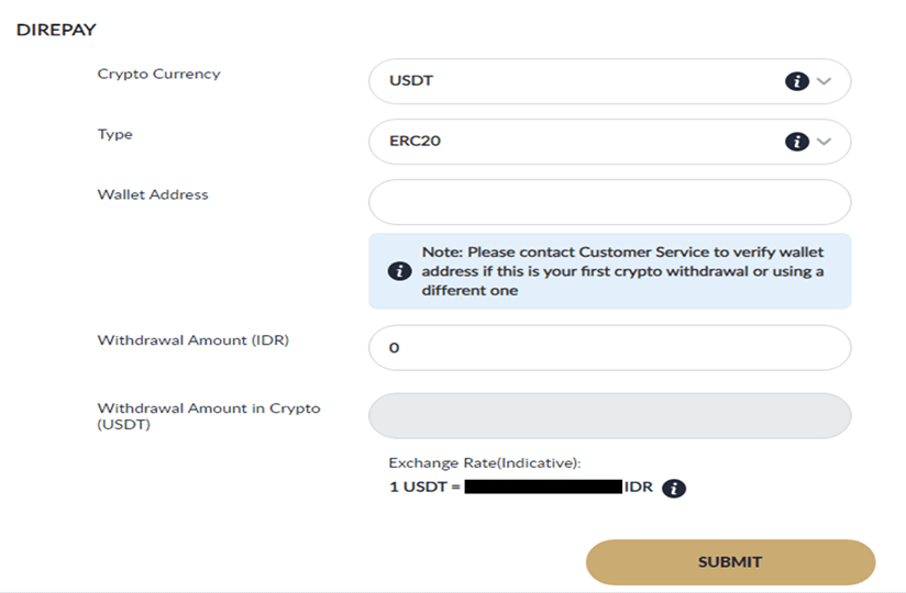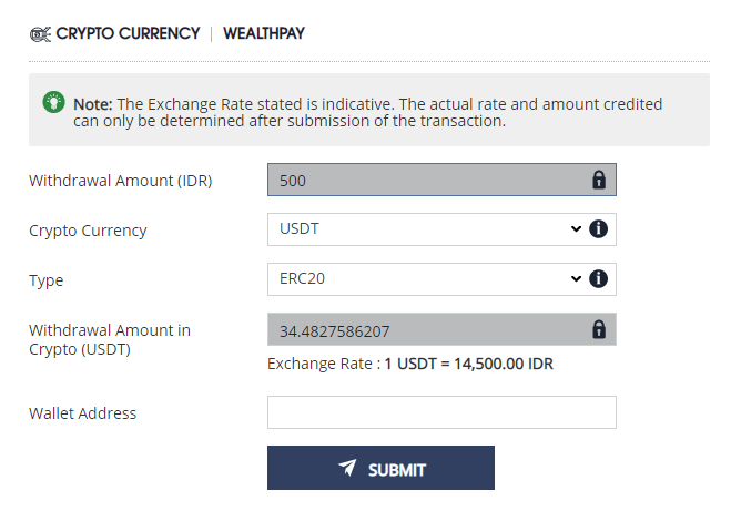 - Ensure to select the correct TYPE and WALLET ADDRESS. Take note of EXCHANGE RATE >> click SUBMIT to continue