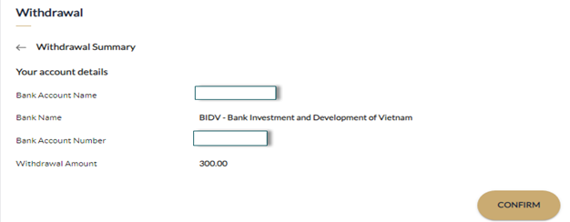 - Click CONFIRM to confirm your withdrawal, or click BACK to edit